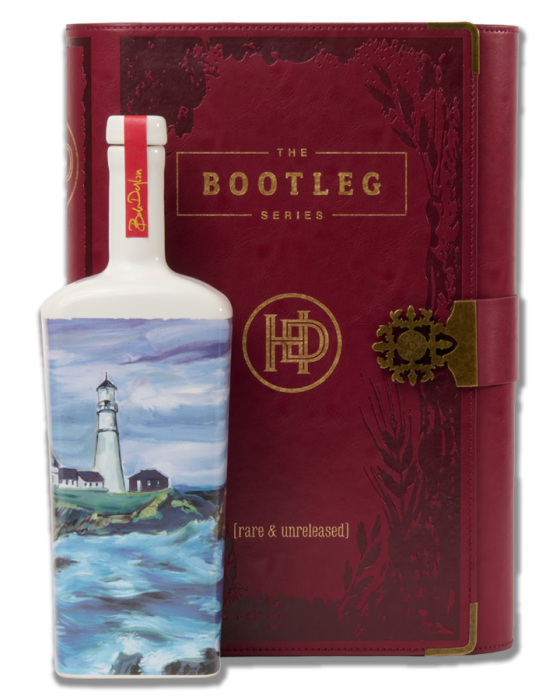 The ceramic bottle for Bootleg Vol. IV features Lighthouse in Maine, 2017 by Bob Dylan inside a handmade leather journal.