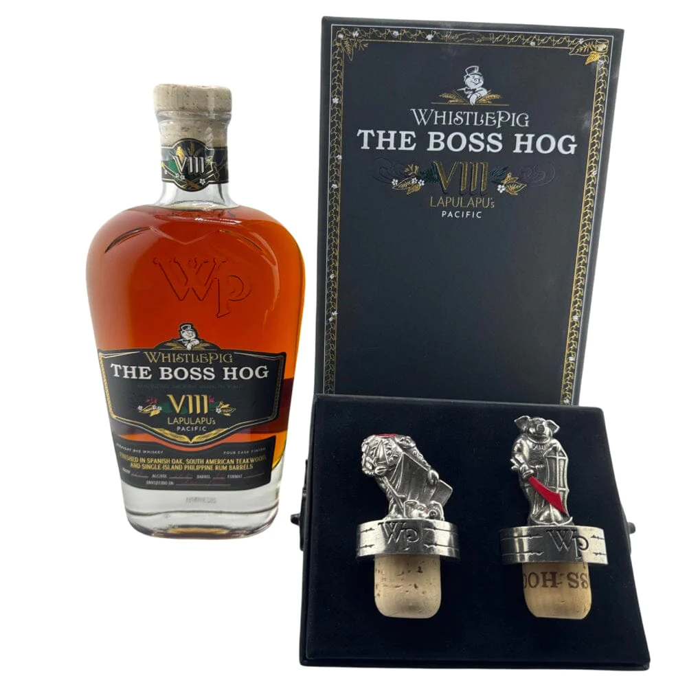 To create this ridiculously rare “B-side” of The Boss Hog, eleven barrels of The Boss Hog VIII encountered all four barrels from the VII/VIII sequel. Aged In Andalucia, Espana, the whiskey was lost at sea in the spring of 2022. WhistlePig celebrates its happy recovery with a set of limited edition toppers inspired by the battle of resistance.